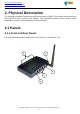 http://www.3jtech.com.tw http://www.pnpipcameras.com DWR User’s Guide 2.1.2 Bottom Panel For more detailed description, please refer to the Section 2.2 and Section 2.2.2. 6 2.2 Illustration No. in Figures Name on DWR Description Remark Refer to section 2.2.1 for front and real panels information. 1 WAN Port For the access of Internet 2 LAN1~LAN 4 Port Network Connectors To connect to the device and Refer to section 2.2.1 for front Ethernet port via RJ45 cable and real panels information.