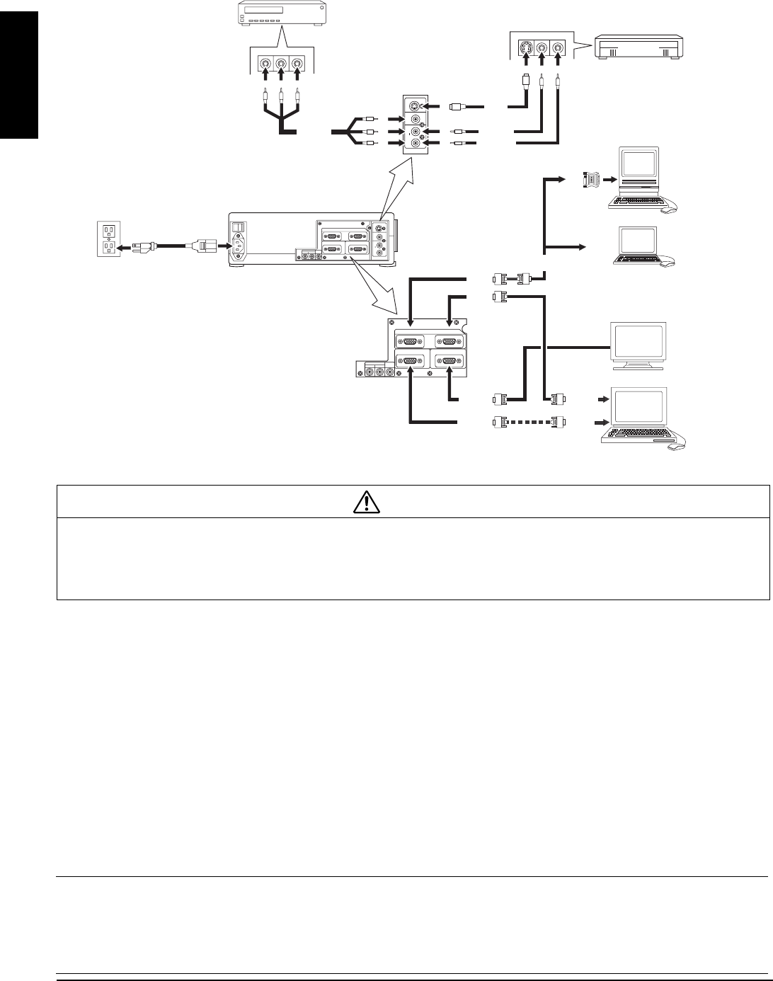 Turn power off to all devices before making connections. Never plug anything into the projector or