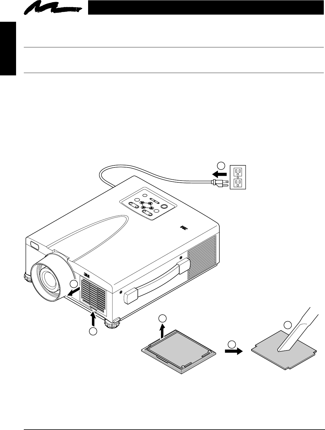 1. Turn off the MAIN POWER switch of the projector and pull out power cord (1). Let cool for 20 minutes.