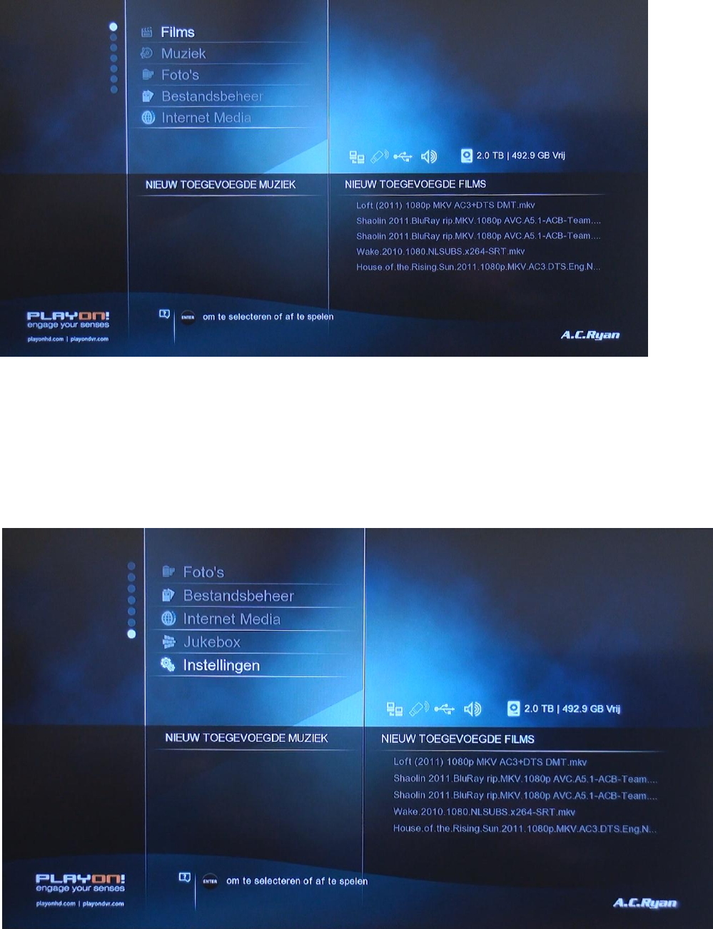 Als de PlayonHD2 voor de eerste keer wordt op gestart dan worden alle films