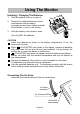 Using The Monitor Installing / Changing The Batteries 1. Slide the battery cover up to open it. 2. Remove the used batteries and insert new batteries into the battery compartment as shown, taking care that the polarities (+) and (-) are correct. 3. Step 1 Step 3 Step 2 Slide the battery cover down to close. Use only R6P, AA batteries. CAUTION Insert the batteries as shown in the battery compartment. If not, the device will not work.