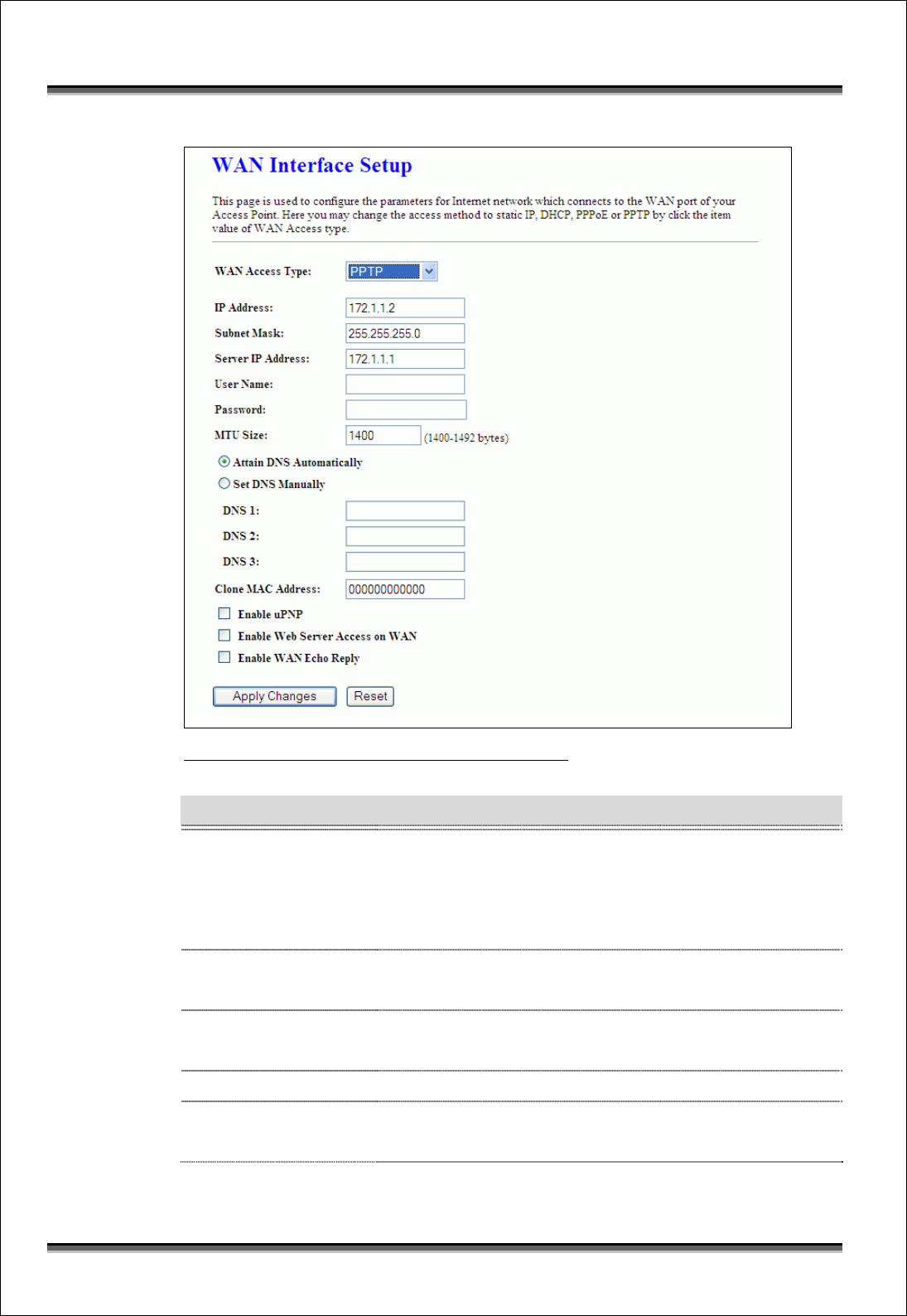 Screen snapshot – WAN Interface Setup – PPTP