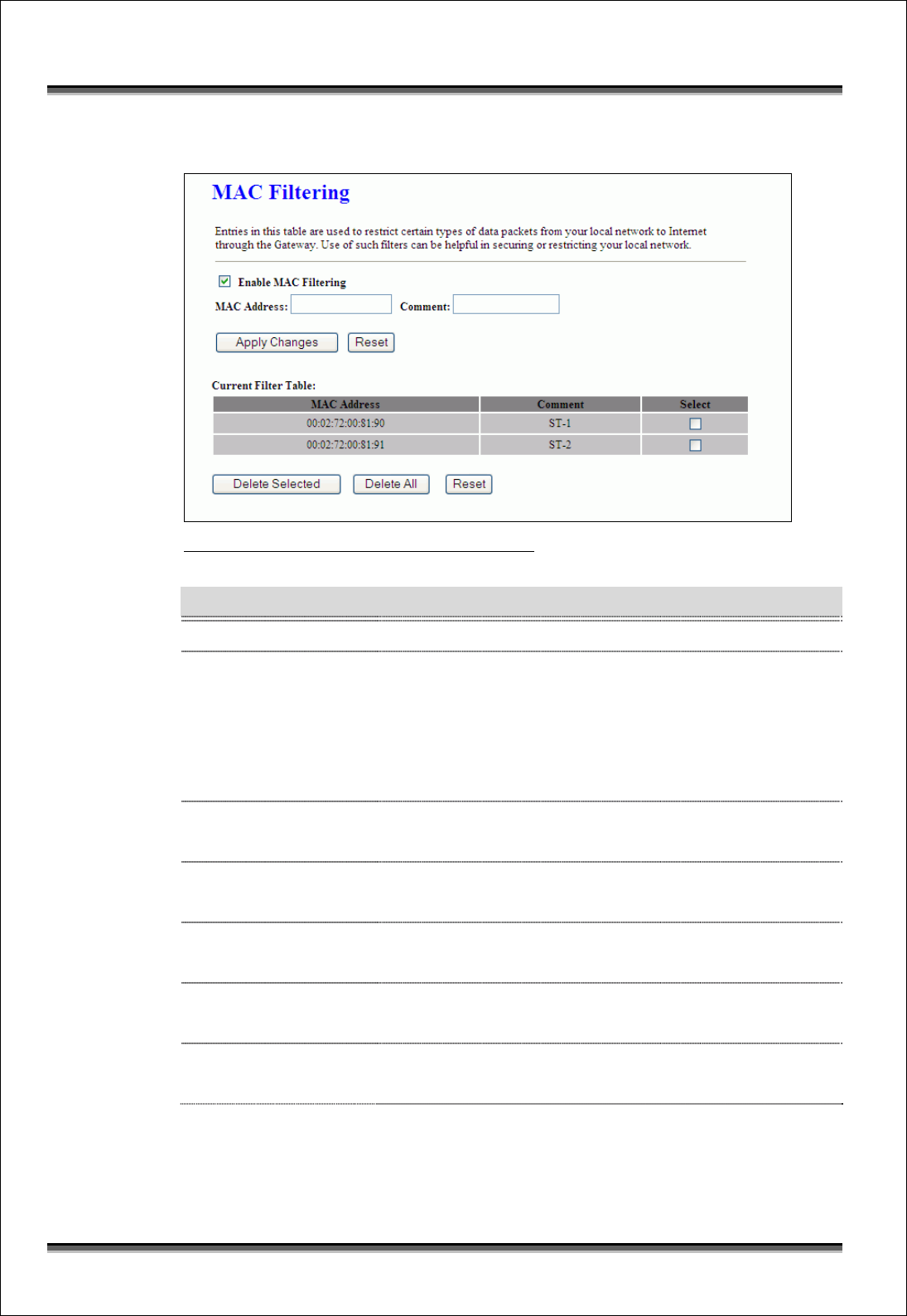 Enable MAC Filtering Click to enable the MAC filtering security function.
