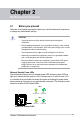 Chapter 2 Motherboard information 2.1 Before you proceed Take note of the following precautions before you install motherboard components or change any motherboard settings. CAUTION! • Unplug the power cord from the wall socket before touching any component. • Before handling components, use a grounded wrist strap or touch a safely grounded object or a metal object, such as the power supply case, to avoid damaging them due to static electricity.