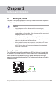 Chapter 2 Motherboard information 2.1 Before you proceed Take note of the following precautions before you install motherboard components or change any motherboard settings. CAUTION! • Unplug the power cord from the wall socket before touching any component. • Before handling components, use a grounded wrist strap or touch a safely grounded object or a metal object, such as the power supply case, to avoid damaging them due to static electricity.