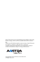 Aastra Telecom does not accept liability for any damages and/or long distance charges, which result from unauthorized and/or unlawful use. While every effort has been made to ensure accuracy, Aastra Telecom is not liable for technical or editorial errors or omissions contained within this documentation. The information contained in this documentation is subject to change without notice. Copyright 2007 Aastra Telecom. www.aastra.com All Rights Reserved.
