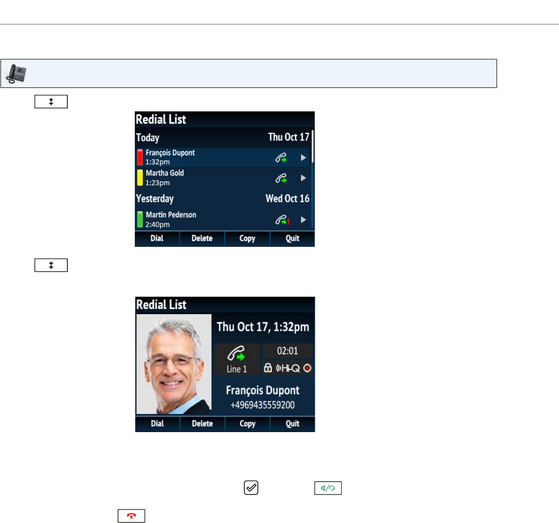 3. To dial the displayed number while in the Redial List, press the button, press , press the Dial softkey, lift
