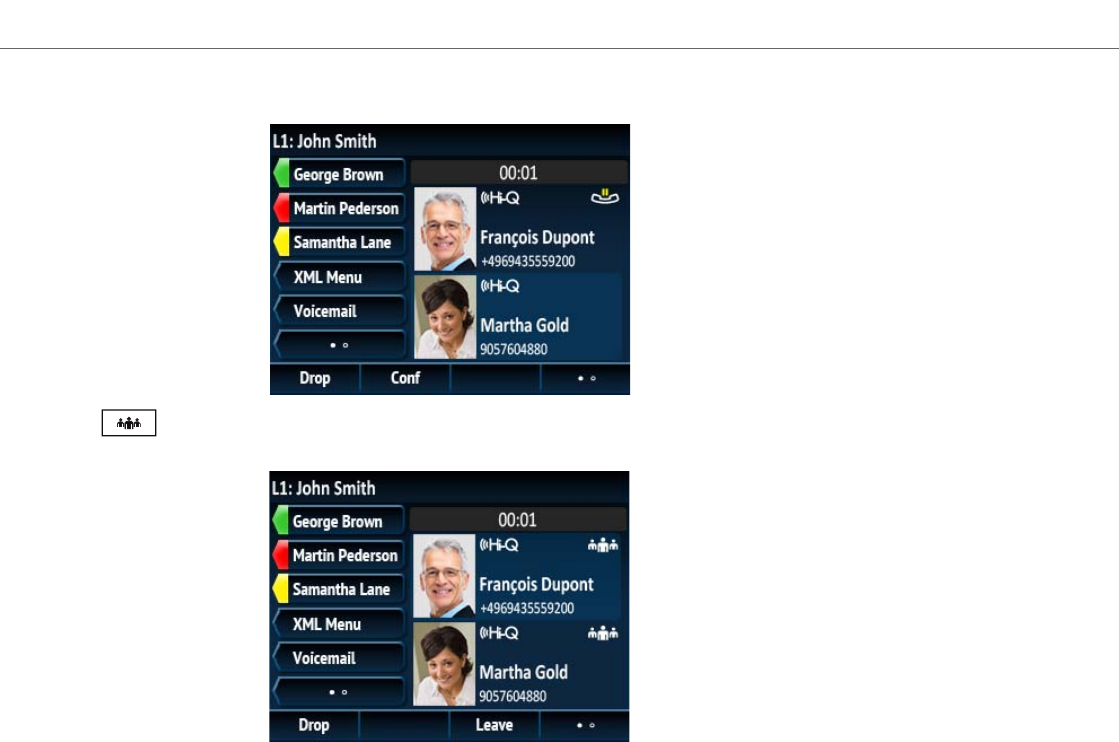 7. Press the key or Conf softkey again to add Party 3 to the conference. Party 2 and Party 3 will connect with