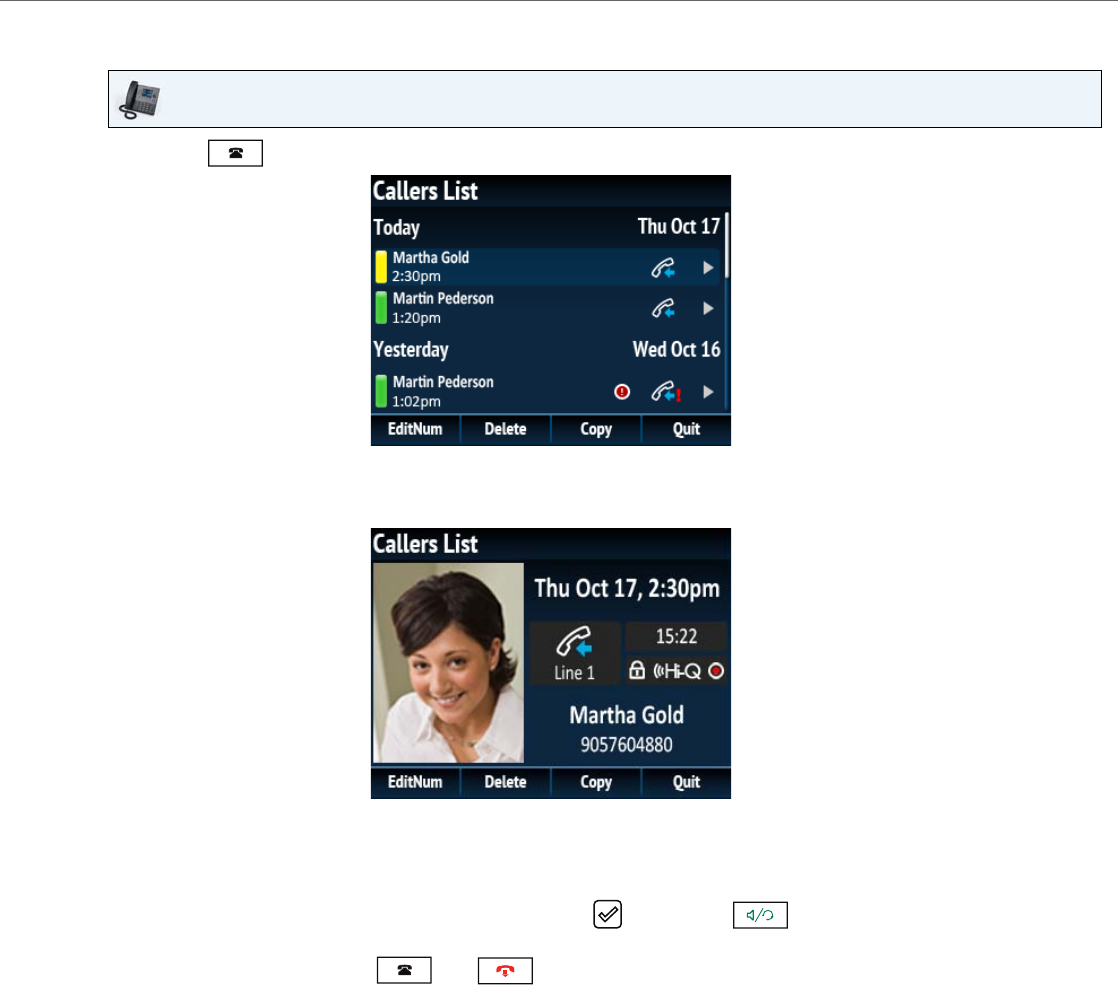 4. To dial the displayed number while in the Callers List, press the button, press , lift the handset, or press