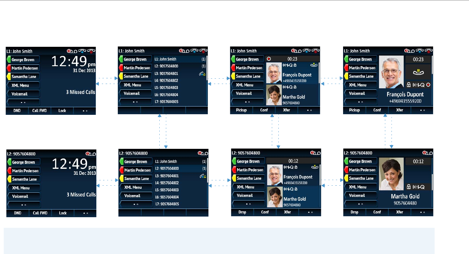 The figure below provides a visual representation of the different screens and the UI behavior when a navigation key is pressed.