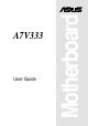 About this guide Features This user manual contains complete information for installing the ASUS A7V333 motherboard. How this guide is organized • • • • • • • Chapter 1: Product introduction. A summary of product features and special attributes of new technologies. Chapter 2: Hardware information. A list of hardware setup procedures and descriptions of all jumpers and connectors on the motherboard. Chapter 3: Powering up. Describes the power up sequence with information on BIOS beep codes.