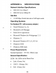 APPENDIX A. SPECIFICATIONS Network Interface Specifications « IEEE 802.3 for basset » IEEE 802.3u for 100BaseTX Data Rate = 10/100 Bps, Double data rate in Full Duplex mode Operating Systems For Notebook PC: ( with accessory adapter) = Nov ell Wetware 3.x, 4.x = Microsoft LAN Manager = Packet Driver Applications = Microsoft Windows for Work groups 3.11 * Windows 3.1 * Microsoft Windows NT 3.51, NT 4.
