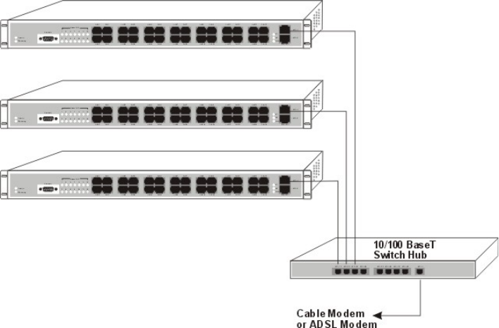 Use an UTP CAT5 cable to connect the switch’s Uplink port to the Uplink of another