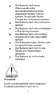 Die Batterie darf keiner Wärmequelle oder Sonneneinstrahlung direkt ausgesetzt werden und an keinem Ort mit sehr hoher Temperatur aufbewahrt werden. Die Batterie darf nicht verbrannt werden Die Batterie darf nicht mit Wasser in Berührung kommen Die Batterie darf nicht zerlegt, angestochen oder beschädigt werden Die Batteriekontakte dürfen nicht kurzgeschlossen werden Die Batterie darf nicht in die Hände von Kleinkindern gelangen.