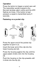 Operation Press the button to trigger a social care call. The transmitter sends a signal to the Secvest wireless alarm centre and the LED flashes six times. If the button is kept pressed, a signal is transmitted every 5 seconds. Fastening on a pocket clip Press the upper end of the pocket clip together to open it (1). Insert the lower end of the clip into the lower housing slot (2). Press the housing against the clip until the upper plastic knobs click into the housing (3).