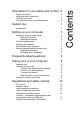 Safety instructions Additional safety information Disposal instructions Tips and information for comfortable use System tour Environment Setting up your computer Necessary to know before setup Selecting a location Opening the package Connecting peripherals Starting your computer Shutting down your computer System upgrade (selected models only) Opening the computer Setting up new components iii v vi vii 1 2 3 3 3 3 4 4 4 4 5 5 Frequently asked questions 6 Taking care of your computer 8 Important ti