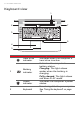 - Your Predator notebook tour Keyboard view 1 7 2 3 6 4 5 # 1 Icon Item Hard drive indicator Battery indicator Power indicator 2 Keyboard Description Indicates when the computer’s hard drive is active. Indicates the computer’s battery status. Charging: The light shows amber when the battery is charging. Fully charged: The light shows red when in AC mode. Indicates the computer’s power status. For entering data into your computer. See "Using the keyboard" on page 16.