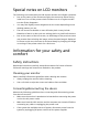 1 Special notes on LCD monitors Information for your safety and comfort Safety instructions Cleaning your monitor Connecting/disconnecting the device Accessibility Safe listening Warnings Using electrical power Product servicing Additional safety information IT equipment recycling information Disposal instructions LCD pixel statement Tips and information for comfortable use Federal Communications Commission Declaration of Conformity Unpacking Attaching/removing the base Screen position adjustment Connectin