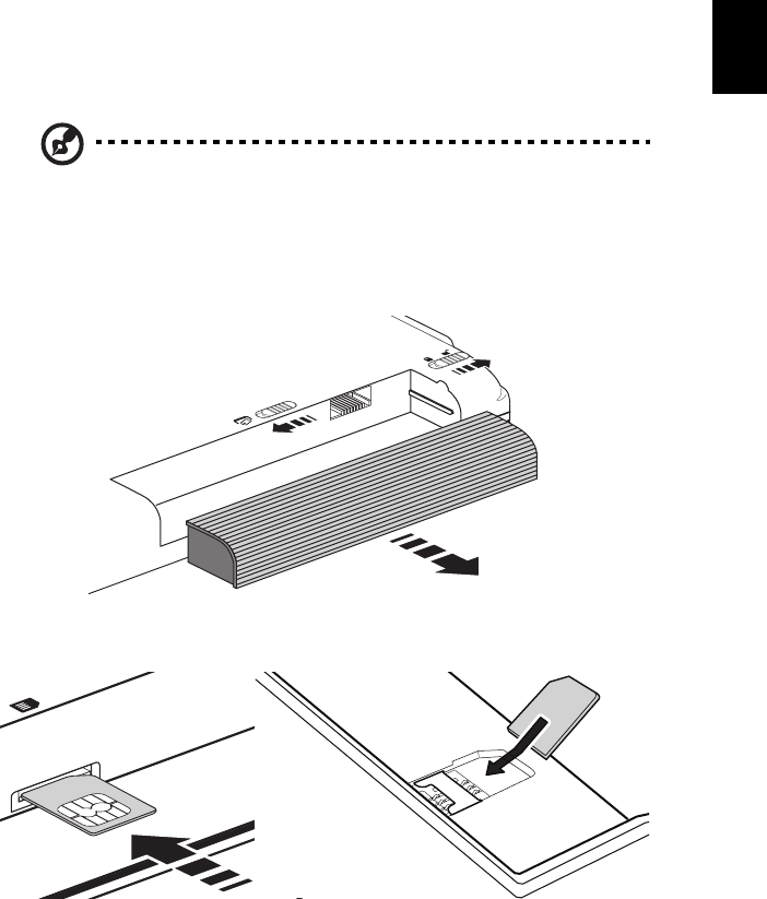 Install your SIM card Note: Illustrations are for reference only. Actual product specifications may vary. 1 Turn off the power and disconnect the AC adapter. 2 Remove the battery. 3 Put the new SIM card into the SIM card slot. 4 Insert battery and power on the computer.