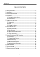 XP-5R Beam F TABLE OF CONTENTS 1. Safety Instruction............................................................................... 2 2. Installation .......................................................................................... 4 3. Technical Specification ..................................................................... 5 4. Description ......................................................................................... 8 4.1 Description of the fixture ...............................