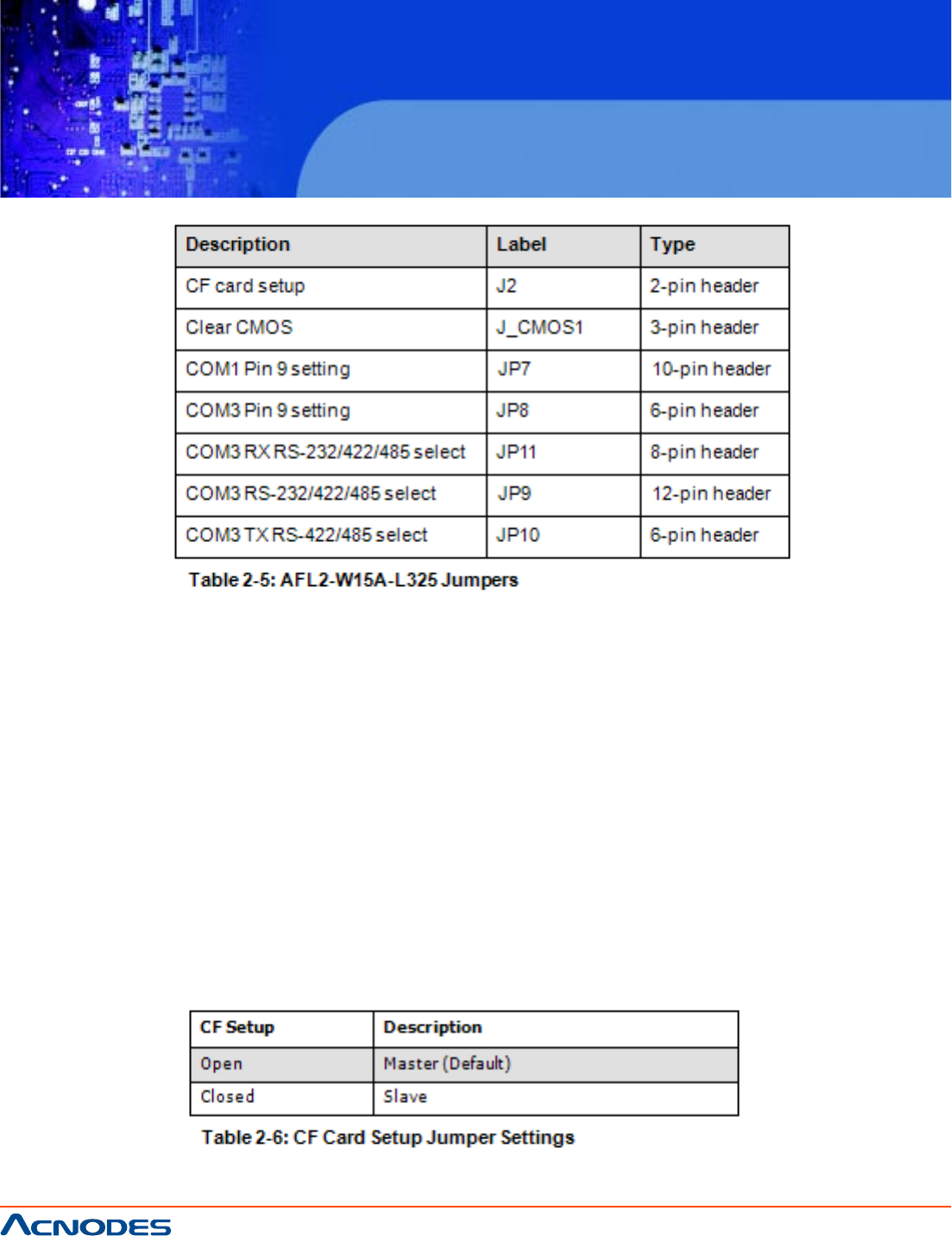 master device. CF Card Setup jumper settings are shown in Table 2-6.