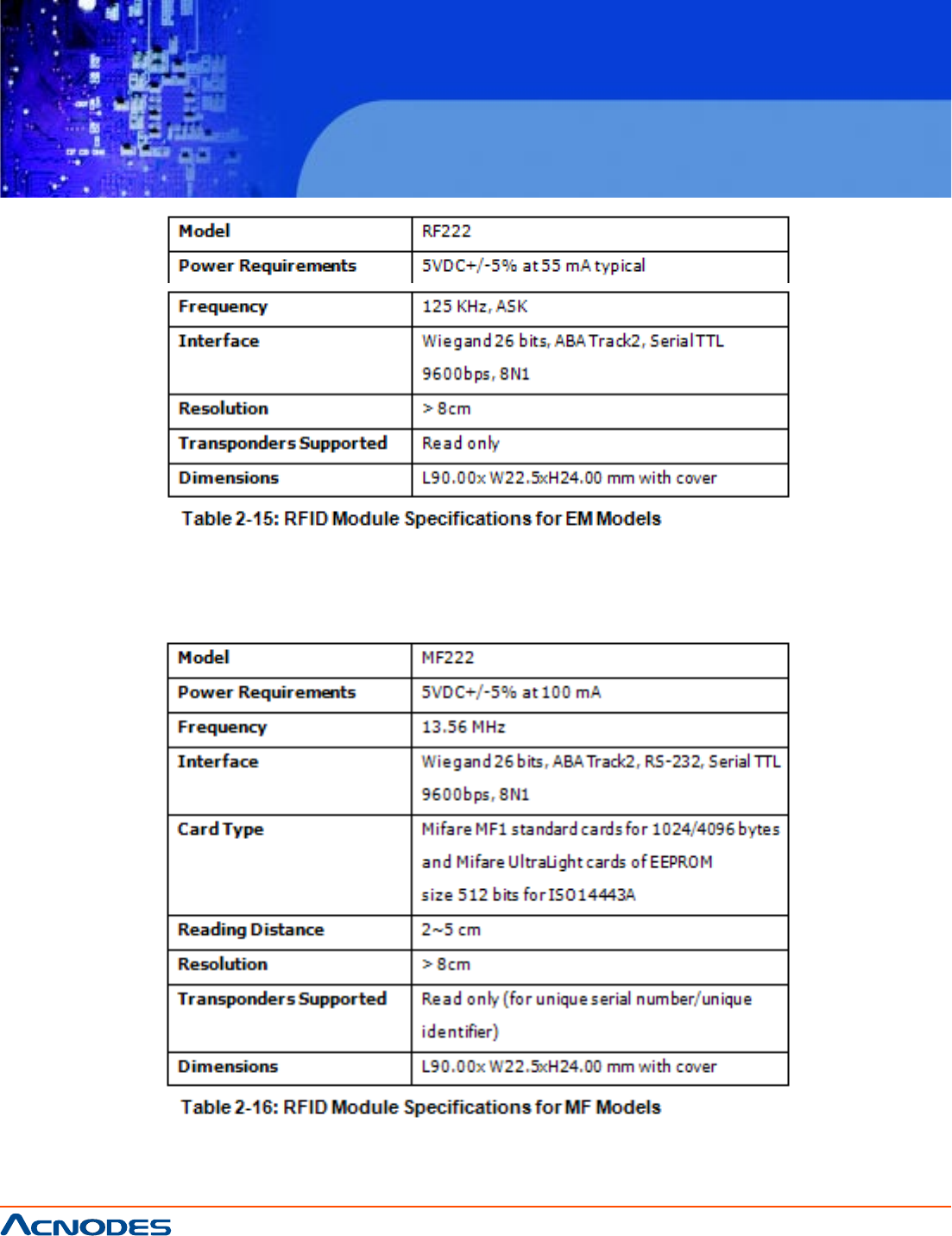 Table 2-15 lists the specifications of the RFID module installed in the FPC7160/ FPC7162 MF models.