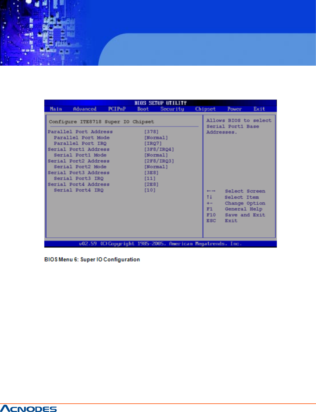 Use the Super IO Configuration menu (BIOS Menu 6) to set or change the con-