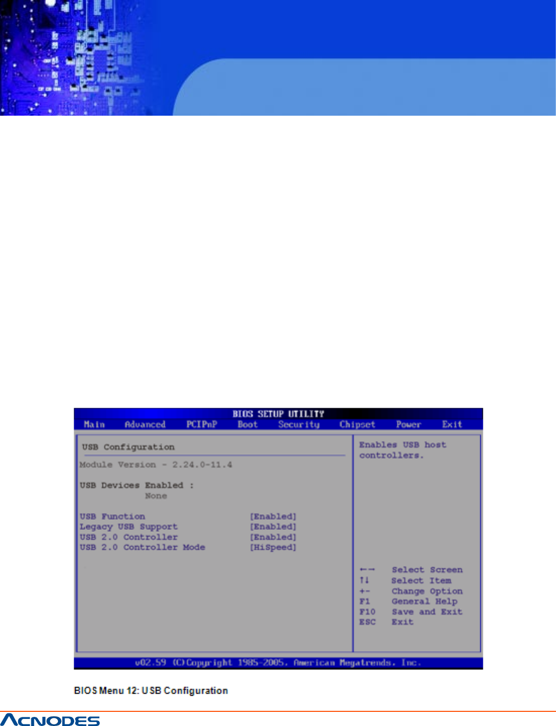 Use the USB Configuration menu (BIOS Menu 12) to read USB configuration information and config-