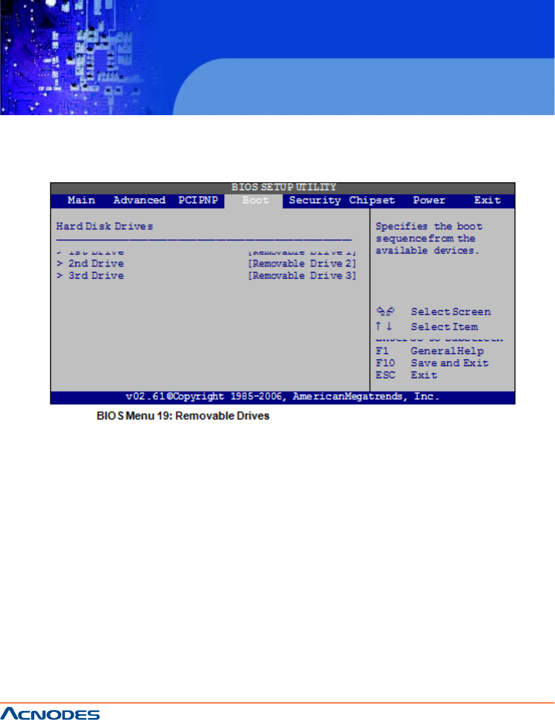 Use the Removable Drives menu (BIOS Menu 19) to specify the boot sequence of the removable drives.