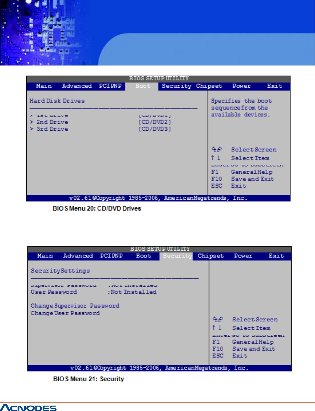 Use the Security menu (BIOS Menu 17) to set system and user passwords.