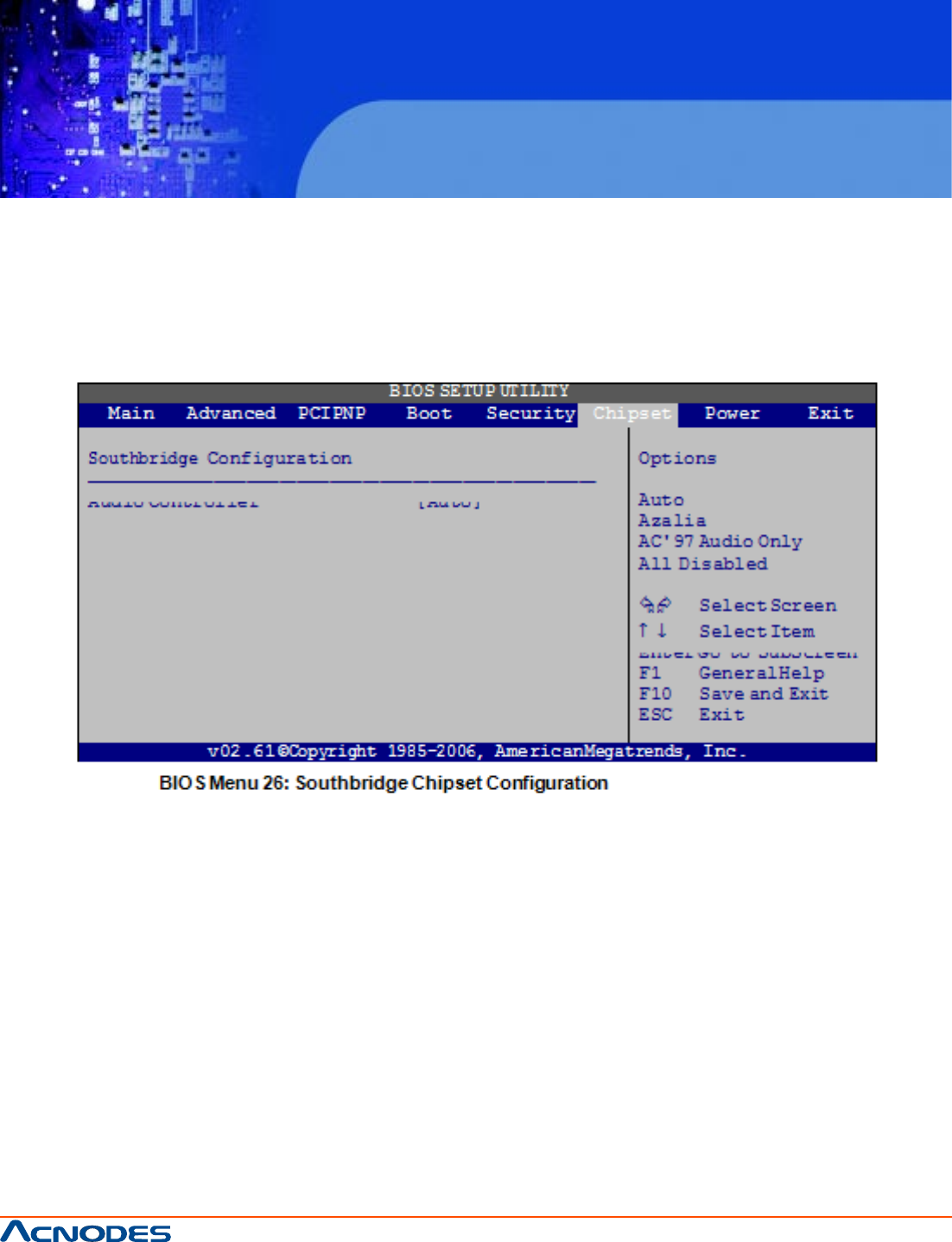 Use the Southbridge Configuration menu (BIOS Menu 26) to configure the Southbridge chipset.
