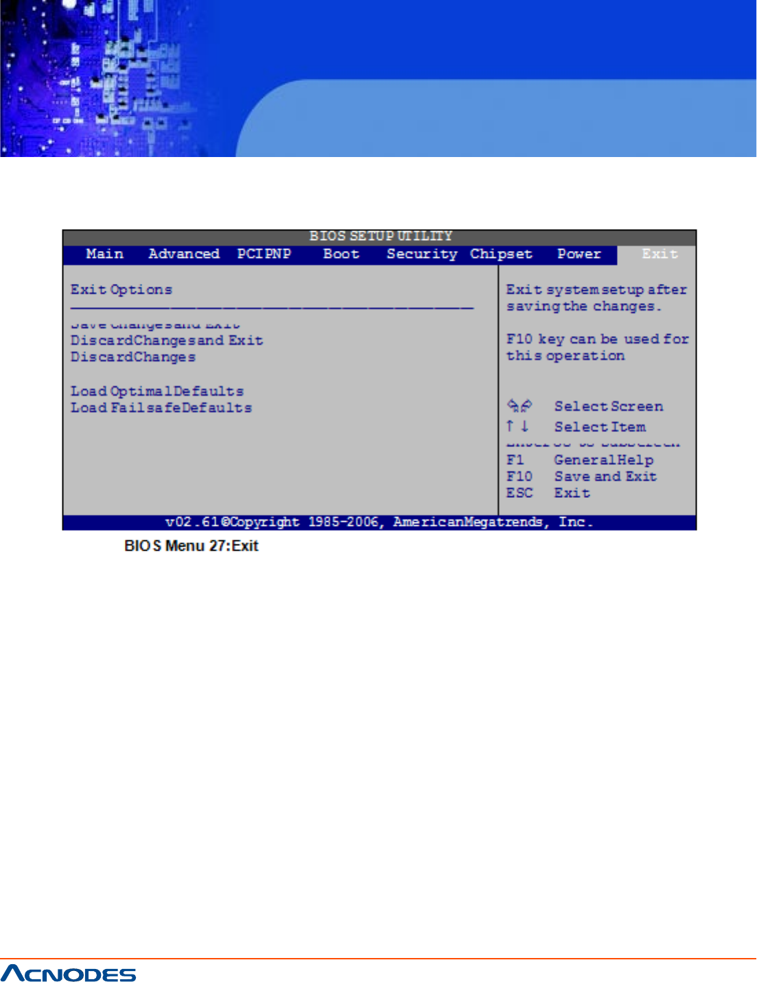 Use the Exit menu (BIOS Menu 21) to load default BIOS values, optimal failsafe values and to save configu-