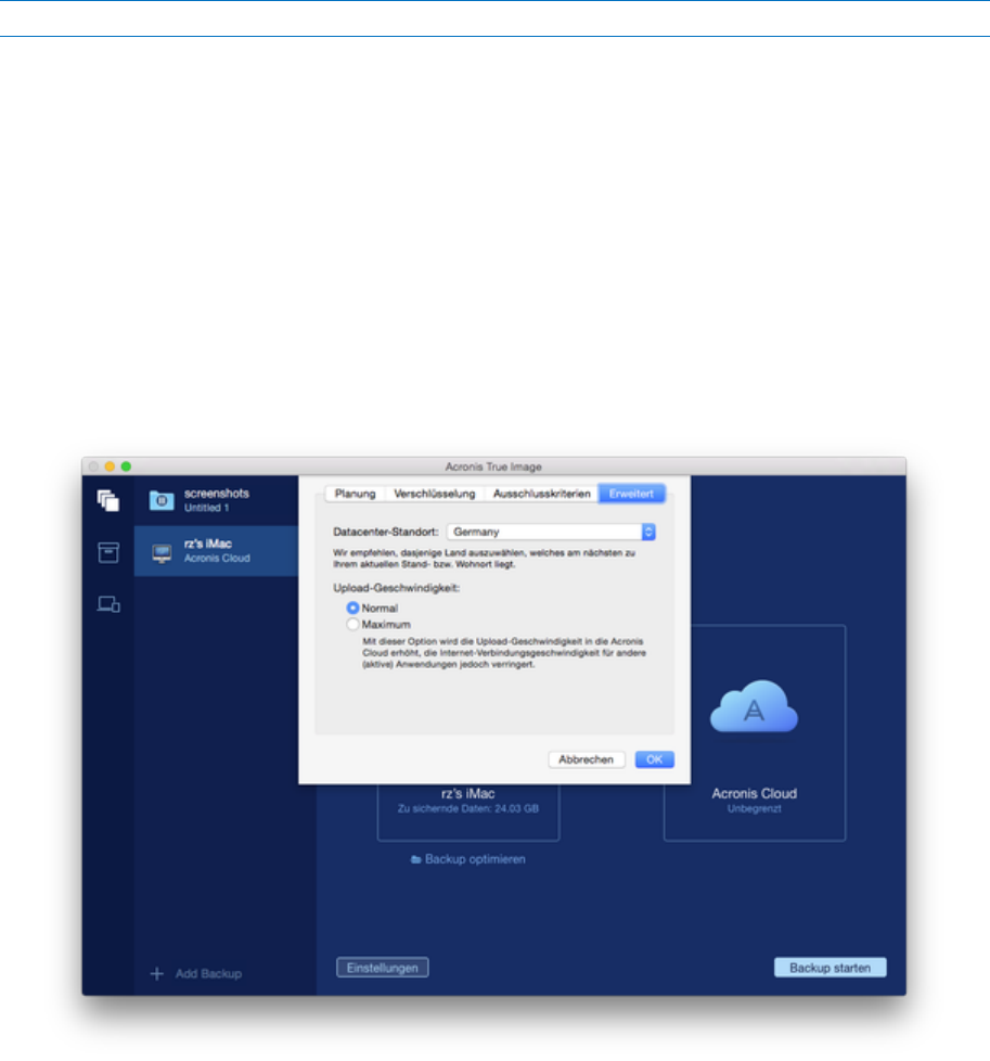 1. Klicken Sie beim Konfigurieren eines Online Backups auf Einstellungen und dann auf Erweitert.