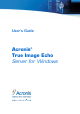 Chapter 1. Introduction 1.1 Acronis® True Image Echo Server – a complete solution for corporate users Acronis True Image Echo Server is a comprehensive backup and recovery solution for a Windows-based server. Acronis True Image Echo Server creates a transportable image, independent of the hardware platform that can be restored directly to and from any virtual or physical environment. Minimizes downtime Acronis True Image Echo Server enables you to restore systems in minutes, not hours or days.