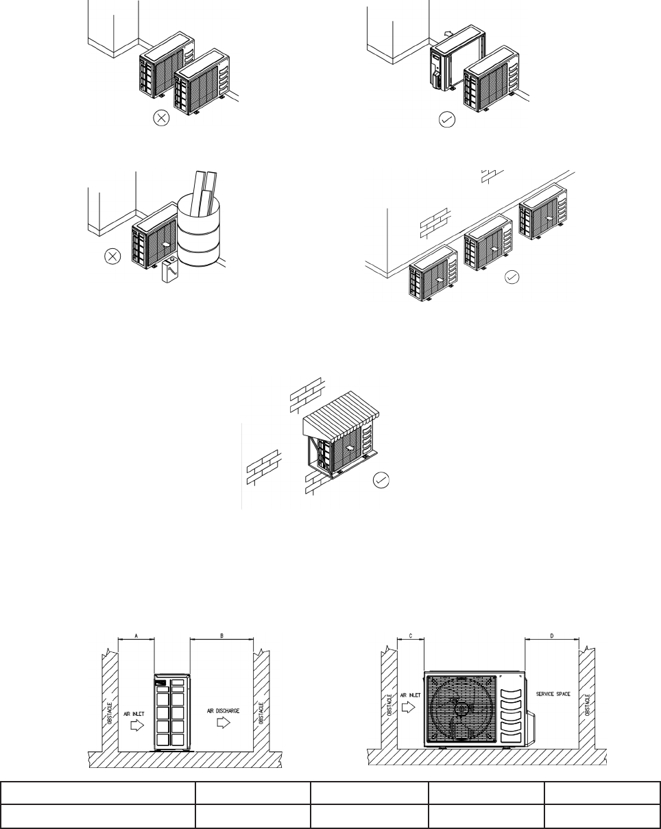 Outdoor units must be installed such that there is no short circuit of the hot discharge air or obstruction to smooth air