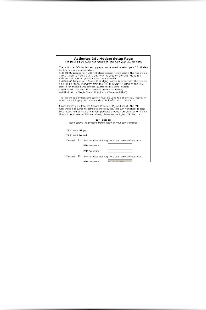 user can configure the ISP Protocol (Bridged, PPPoA, or PPPoE) and the