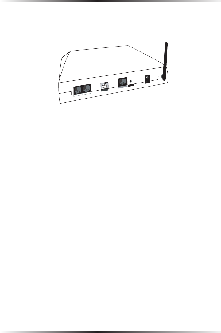 The rear panel of the Modem contains five ports (Line, Phone, USB, Ethernet, and