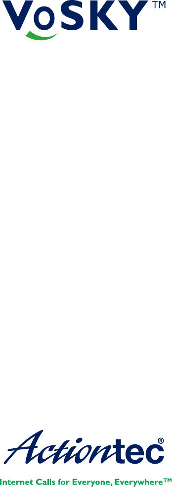 Actiontec VoSKY Call Center User Manual Introduction 1 Thank you for purchasing the Actiontec VoSKY Call Center. Call Center allows you to make free calls over the Internet and budget calls with Skype™ any time, anywhere. With Call Center, you can use your regular telephone to make long distance calls and even international calls at dramatically reduced rates.