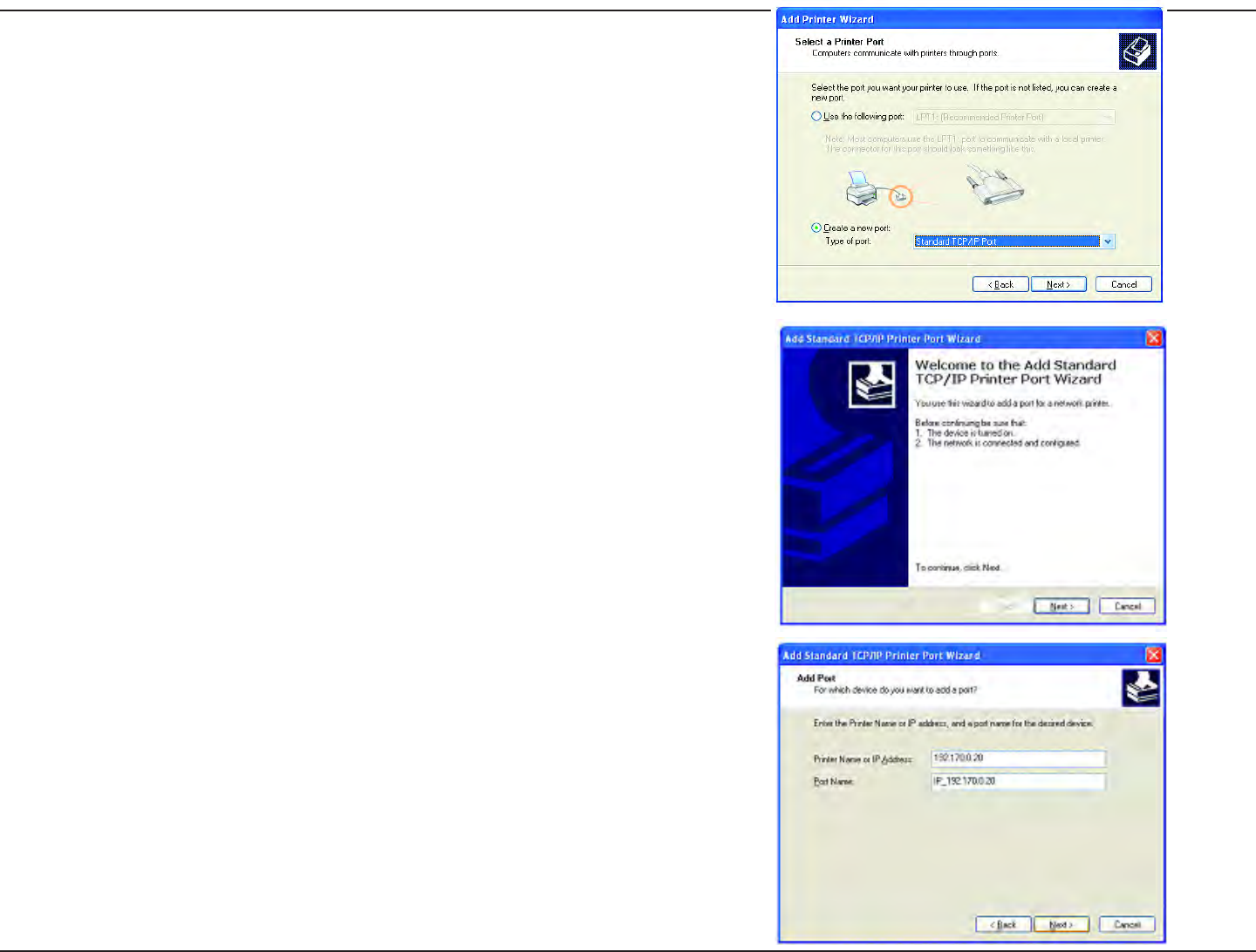 • Enter the Printer IP Address and the Port Name, as shown.