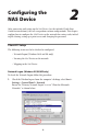 Configuring the NAS Device 2 After connecting and setting up the NAS Device (see the included Quick Start Guide for instructions), the user can perform custom configurations. This chapter explains how to configure the NAS Device on the network for various tasks, including file sharing, setting up a print server, and changing the password.