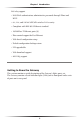 Chapter 1 Introduction DNS relay support s PAP/CHAP authentication, administrative passwords through Telnet and HTTP s 64-, 128-, and 256-bit WEP/WPA wireless LAN security s Compliant with IEEE 802.3 Ethernet standard s 10/100 Base-T Ethernet ports (4) s Flow control support for Fast Ethernet s Web-based configuration setup s Default configuration backup restore s FTP upgradeable s Web download support s 802.