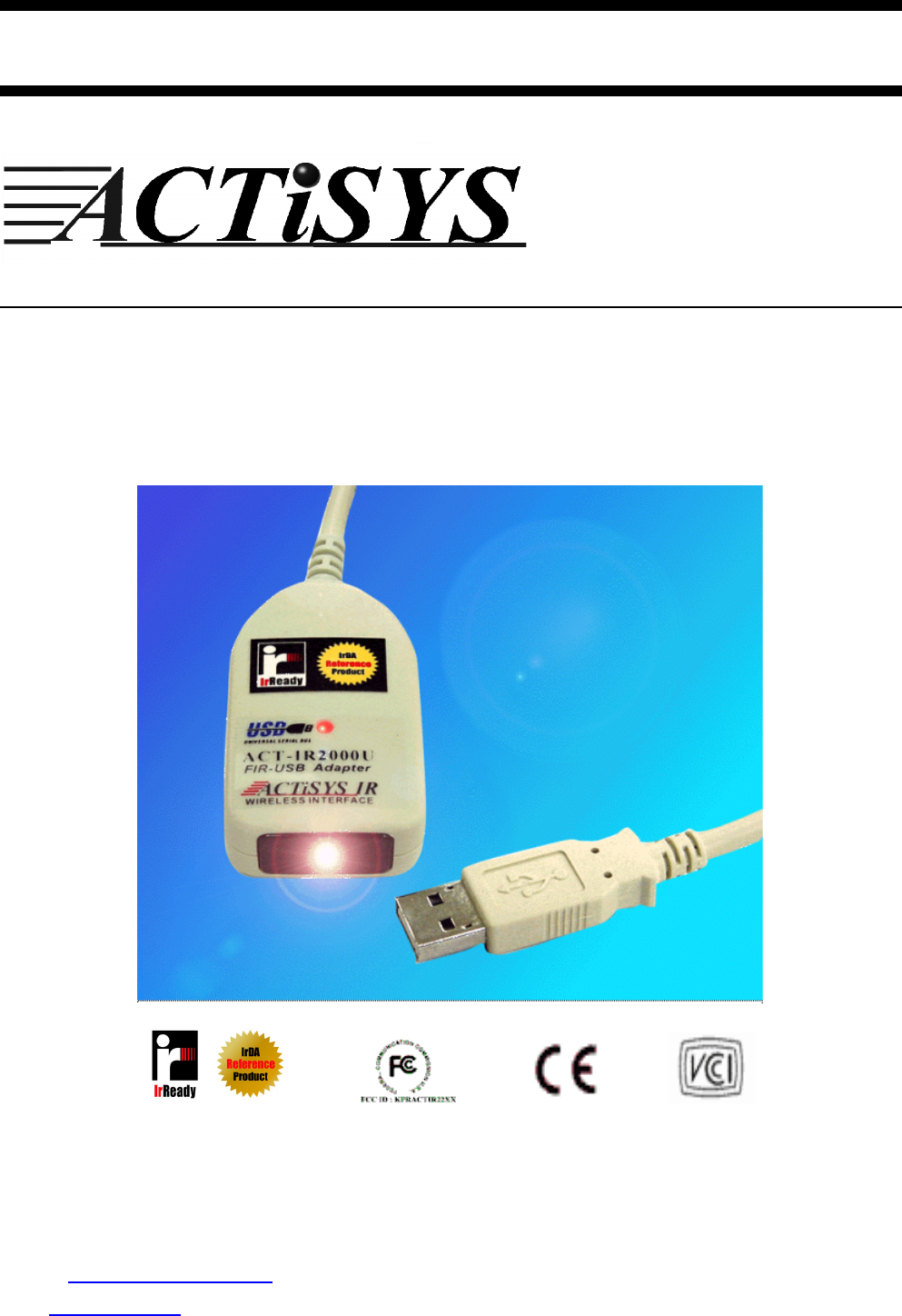 ACTiSYS ACTiSYS ACT-IR2000UL Series User’s Manual 14 CONTACT INFORMATION ACTiSYS Corporation. 48511 Warm Springs Blvd, Suite 206 Fremont, CA 94539, USA TEL: (510) 490-8024, FAX: (510) 623-7268 E-Mail: irda-support@actisys.com Web: www.actisys.com Release 1.5a 2003. 7.
