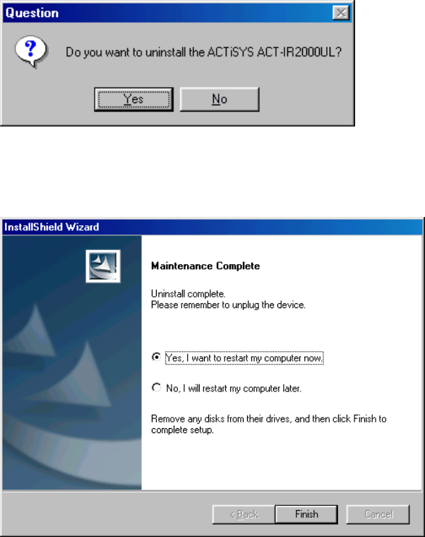 Yes button to uninstall