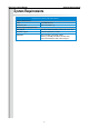 UVS-7111 User's Manual System Requirements System Requirements UVS-7111/7111P/7111W Video Server Internet Environment LAN Wireless LAN Monitor System Requirements 10/100M Ethernet 802.11b or 802.11g OS support Browser support Windows 2000 Professional SP4, XP Home SP2 Internet Explorer 6.x or later Hardware CPU: Pentium 4 2.