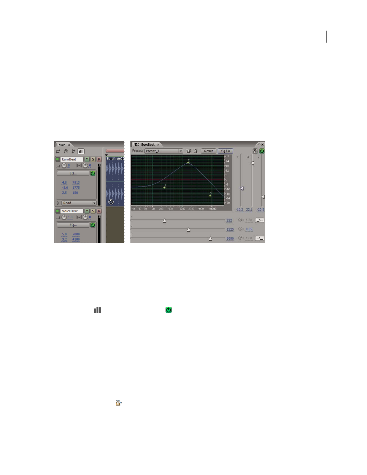 For each track, Multitrack View provides a three-band parametric equalizer that you can access in the Main, Mixer,