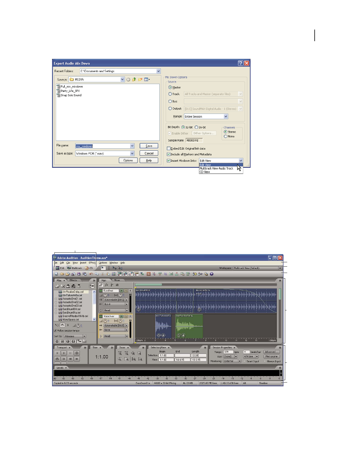 Basic components of Edit, Multitrack, and CD View (Multitrack View shown)