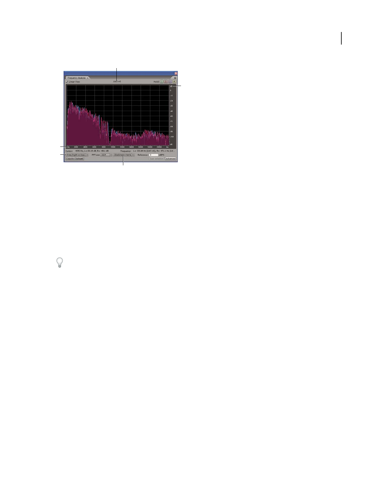 • The overall frequency (and equivalent musical note) at the center point of the selected range is displayed in the