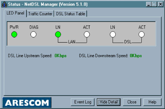 display of the front window LEDs and the DSL Line Upstream and Downstream