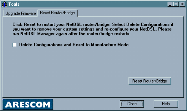 Click Too ls in the NetDSL Manager, and then select the Reset Router tab.
