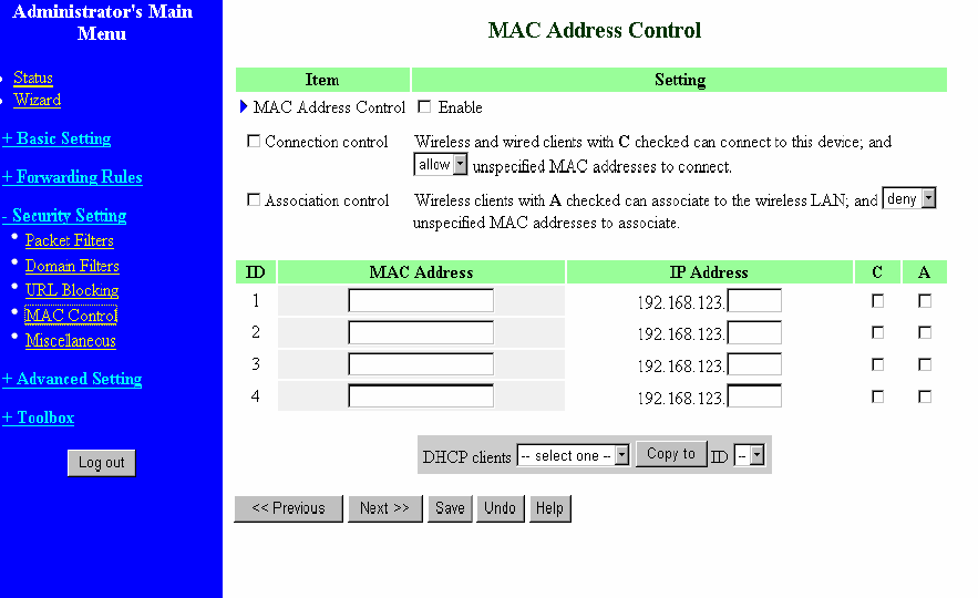 MAC Address Control allows you to assign different access right for different users and to assign a